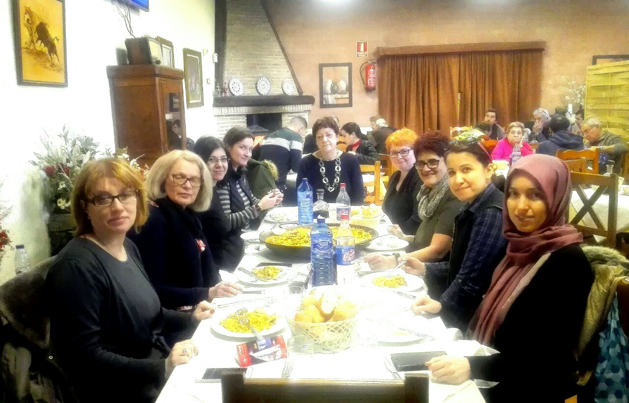 Teachers from five partner countries are having lunch at a local restaurant in Valmojado. The traditional Spanish dish \'paella\' was served us on a big tray.